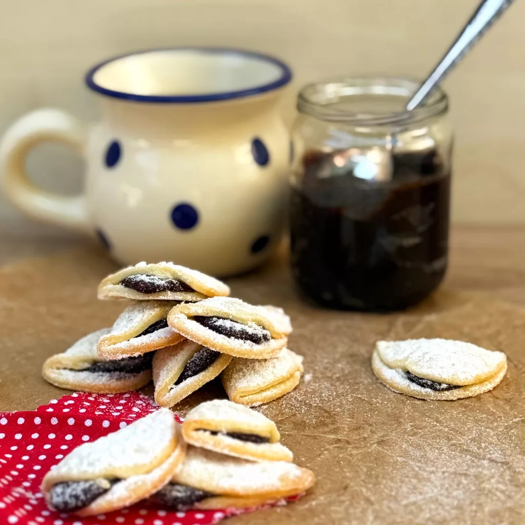 A puha és omlós kis tésztákat, szilvalekvárral töltjük gazdagon, majd sülés után porcukorral hintjük.