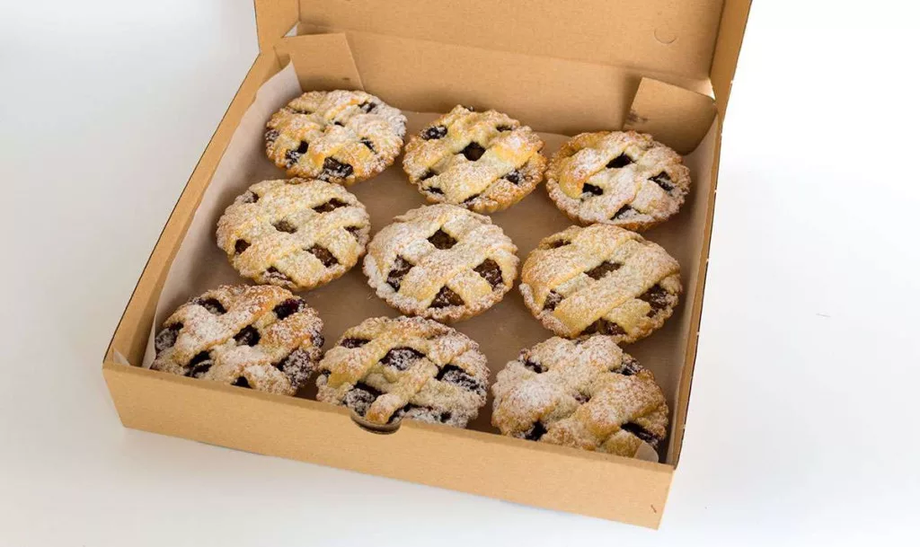 Tenyérnyi méretű pite kosárkák gazdagon szilva, meggy, alma töltelékkel, tetején porcukorral hintve.